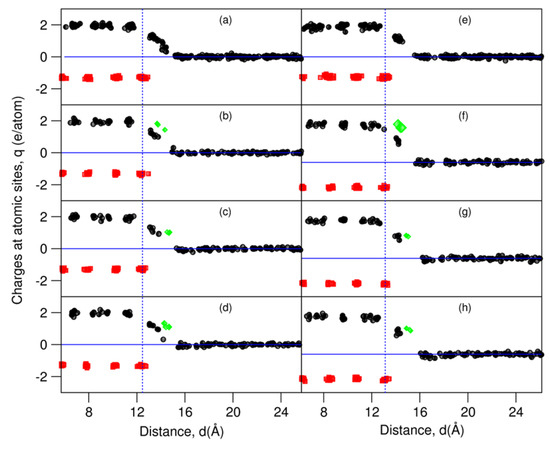 Charges at the atomic sites at L-Al/γ-Al2O3 interfaces, by means of Bader analysis [44,45]. The black spheres represent charges at the Al sites, red at the O sites, and green at the AE sites. (a) L-Al/γ-Al2O3{1 1 1}Al-1, (b) L-Al/γ-Al2O3{1 1 1}AlMg-1, (c) L-Al/γ-Al2O3{1 1 1}AlSr-1, (d) L-Al/γ-Al2O3{1 1 1}AlBa-1, (e) L-Al/γ-Al2O3{1 1 1}Al-2, (f) L-Al/γ-Al2O3{1 1 1}AlMg-2, (g) L-Al/γ-Al2O3{1 1 1}AlSr-2, and (h) L-Al/γ-Al2O3{1 1 1}AlBa-2.