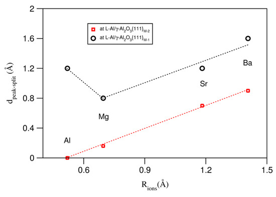 Table 1 also lists the (averaged) metal–oxygen (M–O) bond lengths in the bulk oxides [53,54]. Clearly, the M–O bond increases from Al to Mg, to Sr, and to Ba. Based on the M–O bond lengths, we can obtain the ionic sizes of the metals R(Mm+) = d(M–O) − R(O−q), where R(O−q) = 1.4 Å, as reported in the literature [55,56]. We thus build relationships between the splitting of the terminating metal layer and the AE ionic sizes at the L-Al/γ-Al2O3{1 1 1}AlAE interfaces. The obtained results are plotted in Figure 6.