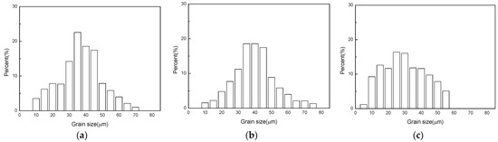 After electron back-scattered diffraction (EBSD) scanning and data analysis, the grain size distribution of DED ZL205A alloys with different deposition processes at 200 °C for 30 min is shown in Figure 5.