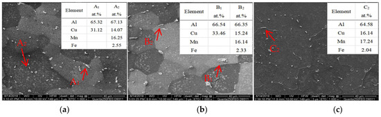 The precipitated phases of the Direct Energy Deposition ZCL205A alloy manufactured using different processes at 200 °C for 30 min are shown in Figure 6. The ZCL205A alloy deposit manufactured using the CMT process has a bulk phase. The θ phase contains two elements of Al and Cu, as shown in Figure 6a in the A1 area. Another long strip of precipitated phases at high temperatures is shown in Figure 6a in the A1 area. EDS analysis of this phase contains Al, Cu, Mn, and Fe. It also includes a small amount of Fe-remelted T phase of impurities. This θ phase is not entirely dissolved into the matrix after solid solution treatment, which is called the undissolved θ phase. It can be seen from Figure 6b that the deposit manufactured using the CMT Pulse process also has a remelted T phase at high temperatures, as shown in Figure 6b in the B2 area, and undissolved θ phases, as shown in Figure 6b in the B1 area. The number and size of the undissolved θ phase increase. The deposits manufactured using the CMT Pulse Advanced process can only detect the remelted T phase at high temperatures, as shown in Figure 6c in the C2 area. No undissolved θ phase was found.