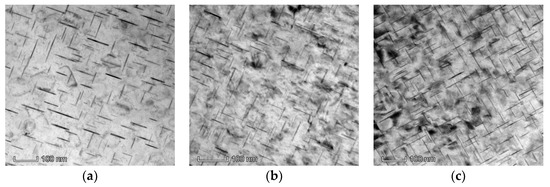 The θ′ phase is the main strengthening phase of Al-Cu alloy, and its size and density directly affect the mechanical properties of the alloy. Figure 7 shows the morphologies of strengthening phases in the deposits manufactured using different processes at room temperature under the peak aging state. The deposits manufactured using the varying deposition processes have the same morphology along the 001-zone axis in the peak aging state, all of which are θ′ phase [17]. The ZCL205A alloy deposited using the CMT process has a uniform θ′ phase size and a diffuse and dense distribution, as shown in Figure 7a. For the sample deposited using the CMT Pulse process, the density of the θ′ phase decreases, and the phase spacing increases, as shown in Figure 7b. The deposit manufactured using the CMT Pulse Advanced process has the highest density of θ′ phase and the smallest phase spacing. The aging precipitation process of ZCL205A alloy is [18]: supersaturated solid solution (αss) → Guinier Preston (GP) zone (GP I zone) → θ″ (GP II zone) → θ′ → θ. Copper atoms segregate to form GP regions and then form the θ′ phase, so the number of copper atoms dissolved in the Al matrix determines the number of precipitated θ′ phases. Since the CMT Pulse process has the largest heat input, the size of the primary θ phase increases, and the number of undissolved θ phases is the largest after solution treatment, as shown in Figure 7c. The number of Cu atoms that dissolved into the aluminum matrix decreases, resulting in a decrease in the number of θ′ phases precipitated during the aging process.