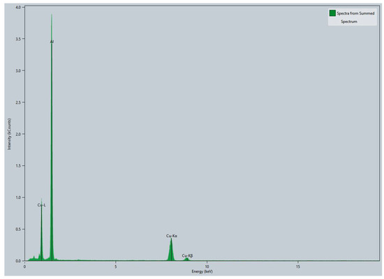 The strengthening phase in the Direct Energy Deposition ZCL205A alloy manufactured using the different processes and held at 200 °C for 30 min is shown in Figure 8. The EDS energy spectrum analysis shows that this phase contains two elements, Al and Cu, as shown in Figure 9, which is the θ phase. The θ phase is believed to be formed by the aggregation and growth of θ′ phase at high temperatures. After a high-temperature process of 200 °C for 30 min, the uniformly distributed nanoscale θ′ phase in the T6 state disappeared, and a large number of precipitated phases with a length of about 0.5 μm appeared. According to the aging precipitation process of the ZCL205A alloy, the main strengthening phase in the peak aging state is the θ′ phase, which is an unstable transition phase. After a high-temperature process, the transition phase aggregates and grows to form a stable phase. The number of stable phases formed after depositing using the different deposition processes undergoing high-temperature processes is different, mainly because the heat input of the varying deposition processes is different, resulting in various sizes of primary θ phases. The heat input of the CMT Pulse Advanced process is the smallest, and the size of the primary θ phase is the smallest. After solution treatment, the number of undissolved θ phases is the smallest, and the density of the θ′ phase is the largest. Therefore, after the high-temperature process, the number of equilibrium θ phases is the largest.