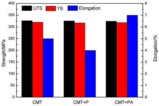 The high-temperature mechanical properties of the Direct Energy Deposition ZCL205A alloy deposited using the different processes are shown in Figure 10. The ultimate tensile strength (UTS) and yield strength (YS) of the different deposition processes at high temperatures are the same: the UTS is 325 MPa, and the yield strength is 320 MPa. The amount of strengthening phase precipitated in the peak state is slightly different due to the different heat inputs of the three deposition processes. However, after the high-temperature process, the strengthening phase in the transition state transforms into a stable phase. The strengthening effect drops rapidly, so the difference in the strengthening phase does not cause significant issues in mechanical properties. The elongations are fairly different: the elongation in the CMT Pulse Advanced process is 7%, and in the CMT Pulse process, it is only 4%. This is caused by the difference in heat inputs in the different processes leading to different sizes of primary θ phases, so the number and size of undissolved θ phases after solution treatment vary greatly, as shown in Figure 6. When the sample is stressed, cracks are first initiated at the position of the θ phases and propagate to the matrix, which reduces the elongation.