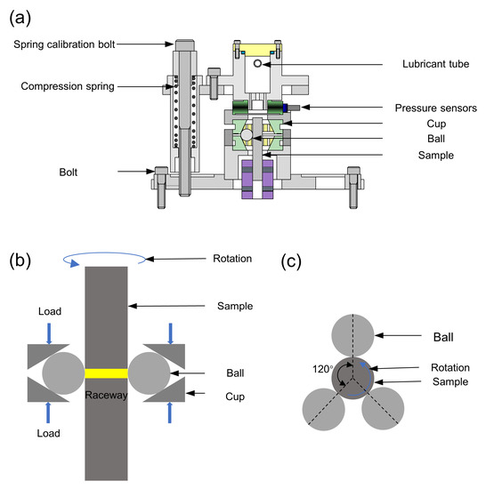 Figure 1. Schematic diagram of the ball-rod rolling contact fatigue tester: (a) cross-section of the ball-rod RCF tester; (b,c) tester schematic.