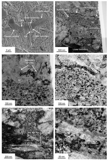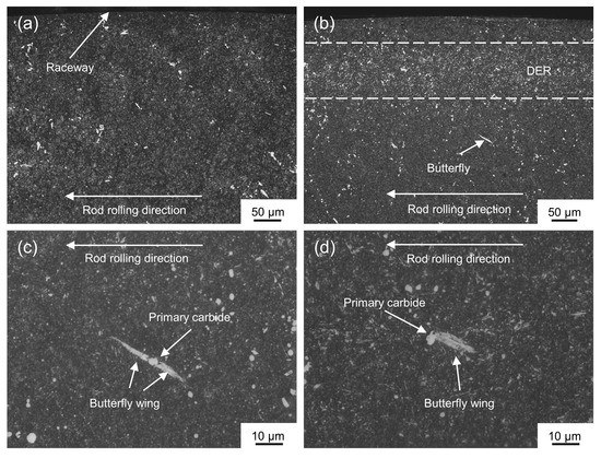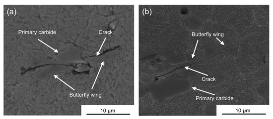 Figure 2c,d show the typical morphology of the butterflies. Butterflies with single or two wings were found to be initiated at the primary carbides. Butterflies were found to form not only in the DER but also outside of the DER, as shown in Figure 2b.