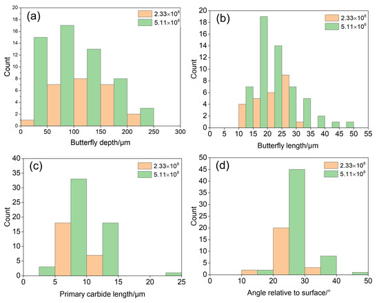 Figure 3 shows the characteristic parameters of the butterflies in the RCF-tested samples under 4 GPa. Butterflies located at a depth of 19 μm to 247 μm below the raceway were observed in the radial cross-section of the RCF-tested sample under 4 GPa after 2.33 × 108 cycles and 5.11 × 108 cycles, as shown in Figure 3a. The depth values of the butterflies from the surface mainly ranged from 50 μm to 200 μm. The number of butterflies in the sample after 5.11 × 108 cycles was higher than the number of butterflies in the sample after 2.33 × 108 cycles under 4 GPa. The number of butterflies increased significantly with the increase in the number of cycles. The length values of the butterflies of the RCF-tested samples ranged from 10 μm to 35 μm under 4 GPa after 2.33 × 108 cycles, as shown in Figure 3b. The length values of the butterflies of the RCF-tested samples ranged from 10 μm to 50 μm under 4 GPa after 5.11 × 108 cycles. The length of the butterflies of the RCF-tested samples increased as the number of cycles increased from 2.33 × 108 cycles to 5.11 × 108 cycles under 4 GPa. The length of the primary carbides associated with butterflies in the RCF-tested samples ranged from 5 μm to 15 μm under 4 GPa after 2.33 × 108 cycles and 5.11 × 108 cycles, as shown in Figure 3c. The inclination values between the butterfly and raceway in the RCF-tested samples ranged from 20° to 30° under 4 GPa after 2.33 × 108 cycles and 5.11 × 108 cycles, as shown in Figure 3d.