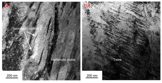 Figure 8. TEM micrographs of an area in the DER at a depth of 55 μm from the raceway surface in the RCF sample (P0 = 5 GPa, N = 2.12 × 108 cycles): (a) TEM micrograph of the transformed martensite plates; (b) TEM micrograph of the transformed twins.