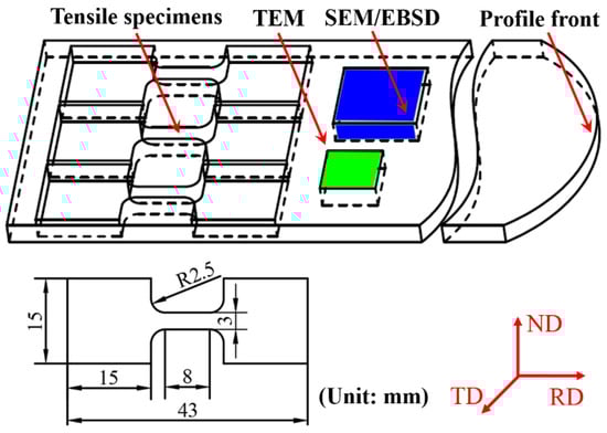 The homogenized samples with a thickness of 20 mm were hot rolled into plates of 7.06 mm, 5.80 mm, 3.72 mm and 2.36 mm thickness at 420 °C (corresponding to rolling reductions of 64.7%, 72.1%, 81.4% and 88.2%, respectively). Then, the same T6 heat treatment of 510 °C × 1.5 h (quenching in room-temperature water) + 175 °C × 32 h was adopted simultaneously. After that, the tensile specimens were cut along the rolling direction of the plates with wire-cut electrical discharge machining (WEDM, BMG Co., Ltd., Suzhou, China). The gauge dimension (length × width × thickness) of the tensile specimens was 8 mm × 3 mm × 2 mm. The room-temperature tensile tests were carried out on the specimens with different rolling reductions on a BTM 205D electric universal testing machine (WANCE Co., Ltd., Shenzhen, China) at a strain rate of 2 mm/min. The tensile properties of various process states were determined by tensile tests that were repeated three times, and the mean strength and elongation were then calculated. The detailed sampling positions and dimensions of the tensile specimens are shown in Figure 1.