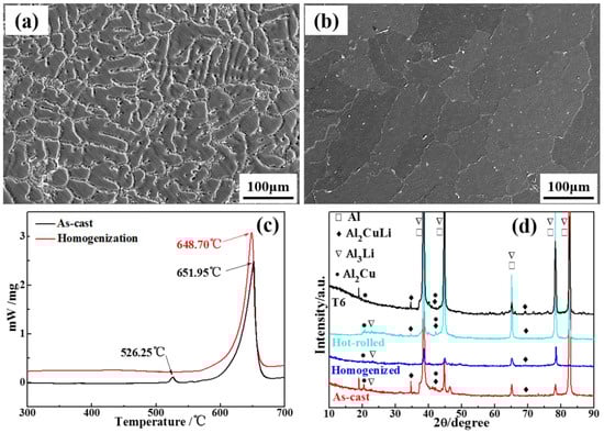 Microstructure characteristics and XRD results of Al-3.2Cu-1.5Li-0.1Sc alloy: (a) As-cast microstructure; (b) Homogenized microstructure; (c) DSC curve of as-cast and homogenized alloy; (d) XRD results of alloy in different states.