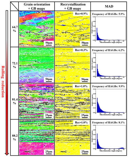 EBSD images of grain structure for the samples with different rolling reductions.