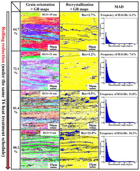 The grain orientation map, recrystallization map and corresponding misorientation angle distribution (MAD) map obtained by EBSD of the alloys subjected to hot rolling are provided in Figure 3. The misorientation angle between contiguous grains θ ≥ 15° refers to high-angle grain boundaries (HAGBs), as indicated by the black lines, while 3° < θ < 15° stands for low-angle grain boundaries (LAGBs), as marked by the white lines. The different types of grains with a blue color, yellow color and red color denote recrystallized grains, subgrains and deformed grains, respectively. It is clearly observed from Figure 3 that the grains show deformed features with fiber-like grain structures, and there are plenty of flat grains elongated along the rolling direction, with varied grain sizes and shapes. In addition, the grains are smaller in size with an increase in the rolling reduction, implying that increased rolling reduction ensures the grains are more broken and form severe serration with a subgrain scale at the grain boundaries. Similar results were reported by Dong et al. [24]. As can be seen from the MAD map, the misorientation angles of most of the grains are less than 15°, and the accumulative fraction of the boundaries with misorientation angles < 15° is 88%, suggesting that very limited recrystallization occurred in the hot rolled Sc-containing Al-Cu-Li alloys with various rolling reductions. Accordingly, it was concluded that regardless of the rolling reduction, the formation of recrystallized grains was effectively inhibited.