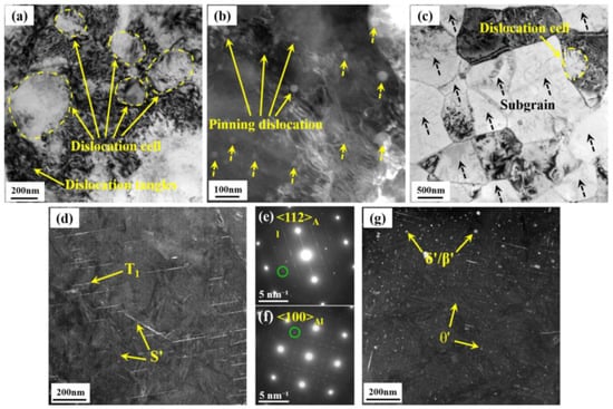 Figure 5 displays the TEM microstructures of the Al-3.2Cu-1.5Li-0.1Sc alloy in different states when the rolling reduction is 81.4%. As can be seen from Figure 5a, there are a substantial number of dislocation tangles and dislocation cells in the hot-rolled alloy, and numerous spherical phases are evenly dispersed in the (sub-) grains and (sub-) grain boundaries. Meanwhile, the phenomenon of some spherical phases pinning the dislocations is also observed (Figure 5b). After T6 peak-aging heat treatment, the alloy presents substructure features with the same orientation, a fine (sub-) grain size and a small amount of dislocation cell structures (Figure 5c). Figure 5d–g shows selected area electron diffraction (SAED) patterns captured from the <112>Al and <100>Al zone axes and the corresponding dark field (DF) TEM images of the studied alloy after T6 treatment followed by hot rolling. As depicted in Figure 5d,e, copious quantities of T1 phases are precipitated in the alloy matrix, corresponding to the diffraction spots and streaks in the <112>Al SAED pattern. Besides the T1 phases, the faint streaks along the <112>Al direction arising from the formation of S’ phases are illustrated in Figure 5e. Additionally, the streaks of the θ’ phases are displayed in the <100>Al SAED pattern (Figure 5f), and some θ’ phases are observed in the DF TEM image, as displayed in Figure 5g. Meanwhile, many Al3Li/Al3(Sc, Zr) particles are detected (Figure 5g), which already existed in the as-cast and homogenized condition (Figure 2d). Combined with Figure 2d, it can be inferred that the precipitates of the Al-3.2Cu-1.5Li-0.1Sc alloy are mainly numerous T1 phases, orthogonal θ’ phases and fine dispersed δ’/β’ phases.