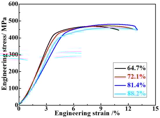 The stress-strain curves of the T6 state Al-3.2Cu-1.5Li-0.1Sc alloys subjected to different amounts of deformation are displayed in Figure 6. It can be seen from Figure 6 that with an increase in the rolling reduction, the tensile strength of the alloys gradually increases and then decreases to the original state. The tensile strengths of the alloys that were hot rolled with deformation of 64.7% and 88.2% exhibit little difference. The tensile strengths of 468.1 ± 5.8 MPa, 471.3 ± 4.3 MPa, 480.4 ± 5.2 MPa and 459.6 ± 6.4 MPa can be achieved at deformations of 64.7%, 72.1%, 81.4% and 88.2%, respectively. Meanwhile, the elongation of the alloys gradually increases and then remains basically unvaried with an increase in the rolling reduction. In addition, the elongation of the alloy reaches 13.0% when the total deformation is 81.4%, which is roughly the same as that obtained at a deformation of 88.2% (12.97%).
