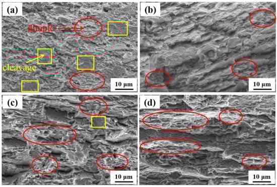 Figure 7 displays the fractographs of the T6-treated alloys with different rolling reductions. According to Figure 7, all the T6 treated samples exhibit a typical mixed fracture mode of dimple-induced trans-granular fracture and intergranular fracture. As shown in Figure 7a, a small number of shallow dimples, some cleavage surfaces and tear ridges are clearly observed on the fracture surface for the alloy with a rolling reduction of 64.7%. Moreover, for the alloys with higher amounts of rolling reduction, more dimples appeared on the fracture surface, as illustrated in Figure 7b–d, which suggests that the fracture mode was occupied by trans-granular fracture. The reduced fraction of the cleavage surface and the larger range and depth of the dimples presented indicate that the ductility of the Sc-containing alloys is enhanced, which is somewhat associated with the observed tensile test results (Figure 6).