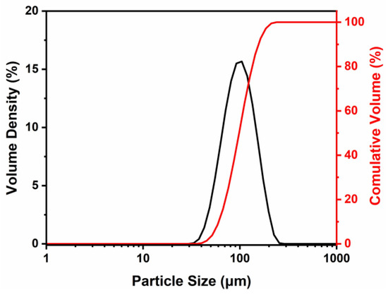 In this work, Ti48Al2Cr2Nb gas-atomized pre-alloyed powder was used to fabricate the samples. The powder was supplied by ATI Co. with D10 = 60.4 μm, D90 = 156 μm, and a mean diameter of 98 μm. Figure 1 illustrates the particle size distribution of the powder, and the chemical composition of the powder is provided in Table 1.
