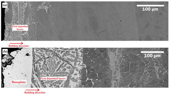 It can be seen that in both conditions, due to the diffusion of elements from the baseplate into the printed samples, the microstructure of the first deposited layers is different from that of the other layers. In more detail, the elements, which are supposed to be mainly Fe, Ni, and Cr, diffused into the deposited material and formed some intermetallic phases within a range of 80 to 230 μm. In the EBM process and during manufacturing, the temperature of the baseplate can reach as high as 1050 °C. Taking Fe as an example, as it has a relatively high (in the range of about 10–15 to 10–13 m2/s) diffusion rate in Ti and Al intermetallics [25], a considerable diffusion of iron into the layers close to the baseplate/material interface is expected. Additionally, considering the as-built and HIPed conditions, it can be clearly understood that these phases exist at further distances from the interface for the HIPed sample. This can be attributed to the post-processing treatment applied to the sample. Therefore, according to Fick’s law, the diffused elements (namely Fe) had more time (at high temperatures) to diffuse greater distances compared to the as-built sample. Moreover, this time-temperature condition can result in the formation of phases that are larger in size (Figure 2b).