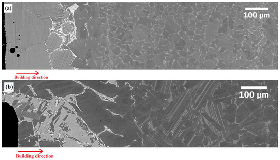 In order to better understand this phenomenon, the samples that were solution annealed at 1320 and 1360 °C were studied as well. As illustrated in Figure 3, the morphology of the phases present in the first deposited layers has been changed by the post-processing solution annealing heat treatment. Moreover, it can be seen that phases containing diffused atoms are present at even greater distances when the sample is heat treated at 1360 °C (Figure 3b).