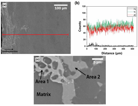 The results of the EDS confirmed the diffusion of alloying elements from the platform into the deposited material. Figure 4a shows the microstructure of the sample in the as-built condition. The concentration of the major elements, namely Ti, Al, and Fe, along the building direction (the red line) is illustrated in Figure 4b. This shows that the diffusion of Fe resulted in a formation of a phase (or phases) that is rich in Fe and has lower amounts of Ti and Al compared to the bulk TiAl alloy.