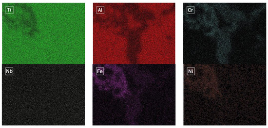 It is clear that the Cr content in the precipitated phases is much higher than its content in the matrix. Cr can improve the toughness properties of the alloy only when it acts as a β-stabilizing element by modifying the microstructure [31] and not by forming unfavorable phases with other elements. Elements distribution maps are also provided for better comparison (Figure 5).