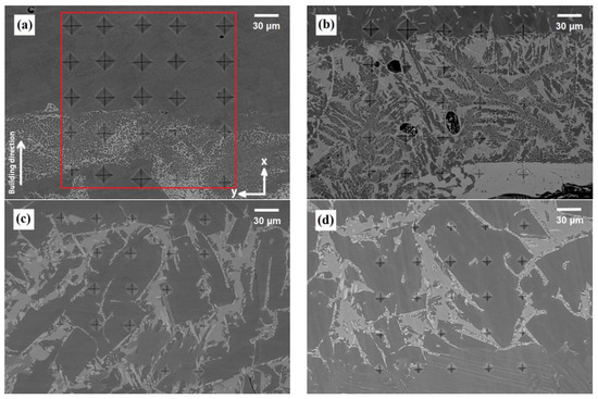 Surface areas of about 0.04 mm2 (200 μm × 200 μm) of each condition (as-built, HIPed, and solution annealed) were scanned by 25 indentations, and the hardness values were measured. The size of this region of interest was kept constant in all conditions. As illustrated in Figure 7, the indentations covered all the possible phases (bright and dark areas), and therefore, the values can be representative of the total microstructure.