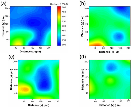 To better understand the changes in the hardness of the microstructure at different locations, the hardness values were mapped accordingly, as shown in Figure 8. The maps represent the areas within the square highlighted in red in Figure 7.