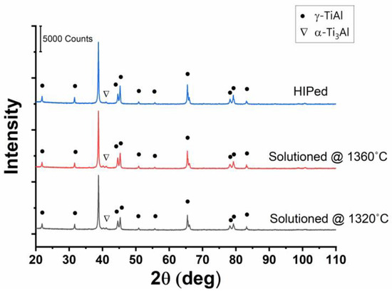 XRD was also performed on different heat-treated samples to verify possible differences in the patterns of the samples. Specimens were cut and prepared along the building direction, and for each sample, the whole surface (7 mm × 7 mm) was scanned. The results (Figure 10) showed no remarkable difference between the patterns of the samples, and it was also revealed that in all samples, the microstructure was mainly composed of γ-TiAl.