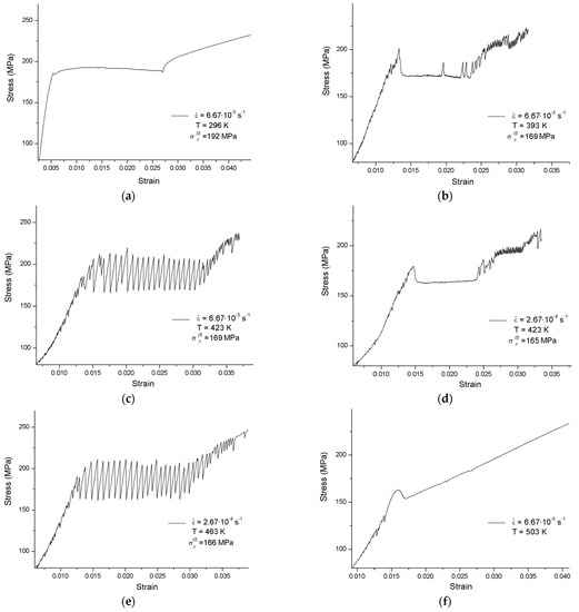 From 503 K upward, there is no serrated yielding if ≤ 6.67·10−5 s−1, such that the plateau degenerates and the stress–strain curve becomes close to its normal parabolic form.