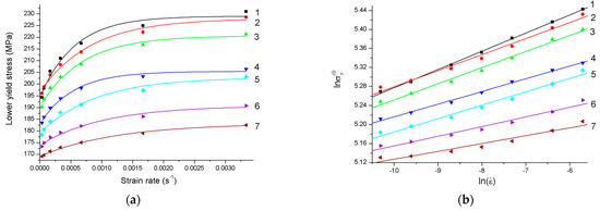 The temperature and the rate should also influence the stress corresponding to the yield plateau, i.e., the lower yield stress . It can be seen from Figure 2a that in the range from room temperature to 393 K, where the plateau is smooth at any rate, the lower yield stress increases nonlinearly with increasing the strain rate. Increasing the temperature decreases irrespective of the rate.
