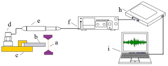 Composition of equipment for monitoring AE signals in WEDM of hard alloys: a—wire-tool; b—workpiece; c—working table; d—accelerometers; e—preamplifiers; f—amplifiers model VShV003 (Izmeritel Ltd., St. Petersburg, Russia); h—external ADC module model E440 (L-CARD Ltd., Moscow, Russia); i—signal-recording device.