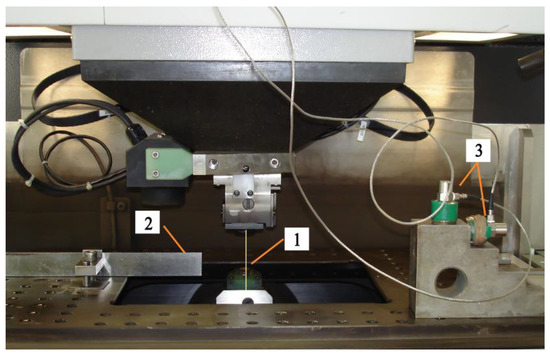 Processing area of the CUT 1000 machine with placed accelerometers: 1—wire tool; 2—workpiece; 3—accelerometers.