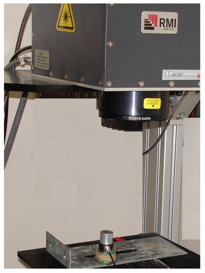 A pulsed laser was additionally used to simulate and monitor the discharge localization process in the experiments. Laser processing and WEDM are technologies that use concentrated energy flows with high power density to influence the workpiece, which determines the general properties of AE signals. In experiments with a laser, a pulsed solid-state diode-pumped laser model U15 (RMI Laser LLC, Lafayette, CO, USA) was used as a radiation source. Figure 3 shows a general view of the U15 laser with a workpiece and an accelerometer attached to the workpiece with a magnet.