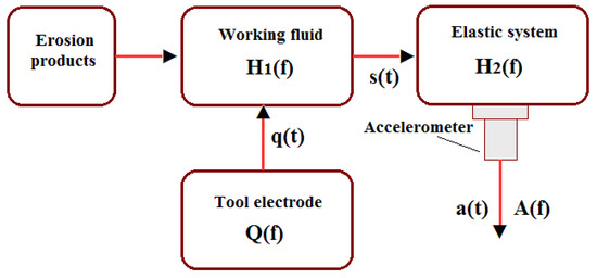 The dynamic model of the WEDM process: Q(f)—spectrum of the discharge current signal q(t); H1(f)—AFC of the working fluid; s(t)—working impact on the workpiece, destroying its material; H2(f)—AFC of the elastic system together with the workpiece; a(t)—vibration signal at the output of the accelerometer with the spectrum A(f); f—frequency; t—time.