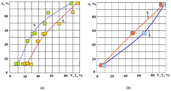 Dependence of the RMS amplitude of the AE signal in the range of 30–40 kHz on the volume of the removed material (V) and the depth of the hole (L): (a)—with variations in discharge energy, pulse duration and frequency; (b)—with variations in discharge energy only. On the graphs, all values along the axes are indicated as a percentage of the maximum values.