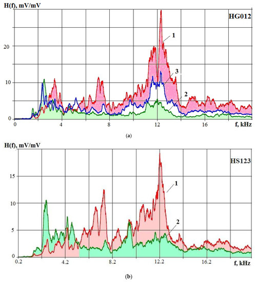 In Figure 6, when comparing the AFC at the initial stage of processing and immediately before the wire electrode break, one can see a characteristic change in the initial form of the AFC compared to the moment of the electrode break. In both cases, before the wire breaks, the values of H(f) at high frequencies decrease noticeably, and even slightly increase at low frequencies. Figure 6a additionally shows an intermediate type of the AFC corresponding to the middle of the recording, where the drop in H(f) values at high frequencies is already noticeable. This indicates that the concentration of erosion products in the IEG increased, and a smaller amount of energy reaches the surface of the workpiece [10,11,25,26,32,33].