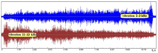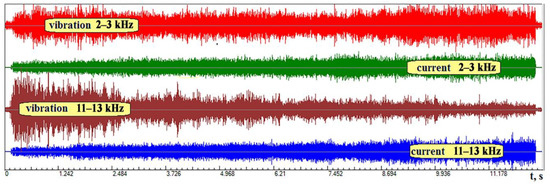 The data presented in Figure 6 show that the approach of the moment of electrode break leads to a decrease in the values of H(f) for a wide frequency range [29,30]. It follows from this that to monitor the WEDM process, it is not necessary to monitor the entire AFC spectrum, however it is sufficient to monitor the transmission coefficient RMS in one or more of the most informative frequency ranges. This is much easier than building an AFC for each point in time. Figure 7 shows an example of recordings of AE signals and discharge current in two frequency ranges with the WEDM of the hard alloy HG012 from the moment of embedding to the break of the electrode. Frequency ranges for further analysis were selected based on the analysis of spectra similar to those shown in Figure 6. Frequency ranges were selected where the amplitude changes are most noticeable.