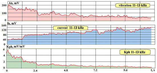 It follows from Figure 8 that after constructing Kph, the decrease in WEDM efficiency becomes more pronounced. The transmission coefficient decreased by 18 times during processing. Figure 9 shows the construction of the transmission coefficient for the low-frequency range (Kpl). RMS of vibration and current amplitudes are shown on the same graph, but the construction order is similar to that of Figure 8. In this frequency range, the changes in the transmission coefficient are not so noticeable, however the Kpl decreased by 40–50% before the electrode break.
