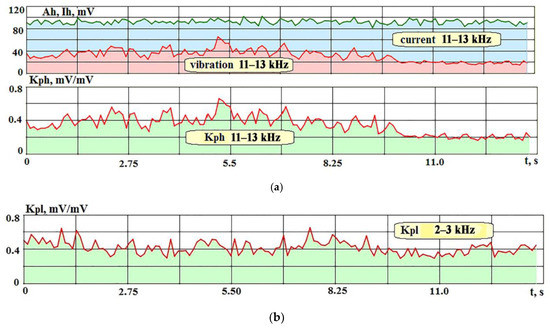 Changes in the transmission coefficients at high and low frequencies from the moment of embedding to the break of the wire electrode during repeated cutting of the hard alloy HG012: (a)—RMS of vibration amplitudes, current, and transmission coefficient Kph for the range 11–13 kHz; (b)—change in the Kpl coefficient for the range 2–3 kHz.