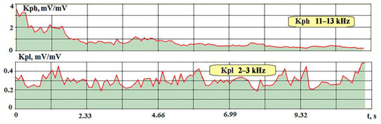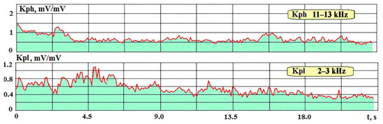 The character of the Kph change shown in Figure 12 is similar to that of HG012 (Figure 8). In this case, the transmission coefficient also has large values at the initial stage, and then gradually drops to values of 0.3–0.4 by the time of the break. In this case, Kpl increases slightly, but not as noticeably as the amplitude of the AE signal in the range of 2–3 kHz in Figure 11.