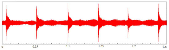 The pulses that have passed through the working medium with AFC H1(f) and transformed in it (in Figure 4—process s(t)), have a dynamic effect on the elastic system, which has its dynamic characteristic with AFC H2(f). The accelerometer, installed on the side of the part, perceives vibrations (in Figure 4—process a(t)), which result from the impact of pulse flows transformed by the working medium and the elastic system of the part. The amplitude spectrum A(f) of the signal a(t) perceived by the accelerometer is determined as in Expression (1):