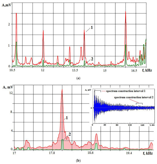 Comparison of AE signal spectra for the initial pulse period (spectrum 1) and after 140 ms (spectrum 2): (a)—spectra for the frequency range of 10–17 kHz; (b)—spectra for the frequency range of 17–20 kHz and recording of the AE signal with time interval marks for constructing spectra.