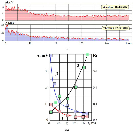Figure 16a shows a continuous change in RMS amplitudes in two frequency ranges, and Figure 16b presents graphs constructed from discrete values of the amplitudes of AE signals in two ranges. Curve 3 in Figure 16b shows the ratio (Kf) of RMS amplitudes in the low-frequency range (10–13 kHz) to amplitudes in the high-frequency range (17–20 kHz). Despite the small spread of discrete results near graph 3, the tendency to increase the Kf ratio over time is very noticeable. At the initial moment Kf = 0.25, and after 160 ms Kf = 0.6. This means that the decrease in amplitudes at high frequencies is ahead of similar processes at lower frequencies. This, in turn, indicates a drop in the power density of radiation affecting the processed material [29,30,31].
