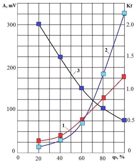 It follows from curve 3 in Figure 17 that an increase in Kf indicates a decrease in the power density qs of the thermal energy flow. It is concluded out that the parameters of the laser radiation pulses did not change, and the power density decreased rapidly when the pulses were applied to one point (Figure 16b). The noted effect can be explained as follows. The products of destruction during laser exposure to the substance in the form of vapor-gas jets spread into the surrounding space. Part of the radiation energy is absorbed and dissipated by the destruction products. The steam phase absorbs and dissipates energy especially strongly. As a result, the initial power density decreases rapidly. As shown in Figure 15b, after 40–50 ms, the amplitude of the AE signal at high frequencies drops and reaches a constant level (the equilibrium level). There is no further decrease in the power density because its decrease reduces the volume of destruction products and, accordingly, energy dissipation and absorption decrease. A decrease in the power density in the case of laser processing does not mean the termination of the melting and evaporation of the material, however if the proportion of evaporation decreases, and the productivity of the process also decreases. A change in the power density forms a variety of laser technologies: at low qs, the material can be heated and hardened without removal. At high qs values, the material evaporates, and plasma forms, and the workpiece material is removed [29,37,38,39].