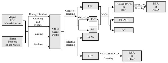 Research on NdFeB scrap recycling has focused on two directions, namely, (1) remanufacturing magnets using scrap recycling [14,15] and (2) recovery of REEs. The recovery of REEs mainly includes hydrometallurgical, pyrometallurgical, electrochemical, etc. [16]. This paper systematically reviews the main recovery methods of used NdFeB magnets and summarizes the advantages and shortcomings of these methods.
