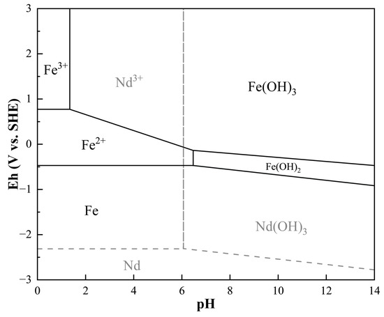 In terms of the chemical precipitation method, according to the Eh-pH diagram for the Nd-H2O system and the Fe-H2O system in Figure 5, RE3+ can remain stable in the solution until pH = 6, while Fe3+ starts to precipitate at a pH of about 2. Therefore, oxidation of Fe2+ to Fe3+, followed by pH adjustment, allows selective removal of Fe3+ [10]. As described in the complete leaching section, the biggest drawback of this method of preferential precipitation of Fe is that it requires the consumption of additional alkaline reagents, since Fe2+ or Fe3+ is always present in the solution. MF (M = Na, K and NH4) can also selectively precipitate REEs. Sun He et al. [104] captured F in industrial wastewater through ultrafine NdFeB waste. This method can reduce the concentration of fluoride ions in fluorinated wastewater, while REEs are recovered by precipitation with Nd(OH)2F. However, the recovery method uses an aqueous solution of HNO3 and KF mixed at a pH about 0. The process does not form a closed loop, and the emission of F- is highly damaging to the environment and cannot be widely promoted yet.
