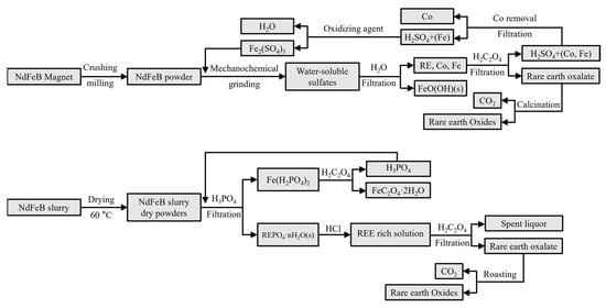 H2C2O4, as an organic acid, namely, can leach NdFeB magnets and also selectively precipitate REEs from the leach liquor of magnets [105]. The typical technical flow chart of the H2C2O4 precipitation method is shown in Figure 6 [106,107]. Although both recycling processes are closed-loop as much as possible, reducing the toxic effects of the emissions on the environment. The residual H2C2O4 is highly susceptible to precipitation by binding Fe2+ or RE3+ during the leaching process, since the dissolution of both RE2(C2O4)3·nH2O and FeC2O4·nH2O is very small. In addition, the sintered NdFeB magnets exhibit passivation behavior in the H2C2O4 solution, and the leaching rate will be greatly reduced [108]. As far as the selective separation of REEs and Fe is concerned, the complex salt precipitation method is the better way for the selective precipitation of REEs because it can avoid the interference of Fe2+ and Fe3+ to the maximum extent [109]. The addition of M2SO4 (M = Na, K and NH4) to the leachate converts RE3+ to (RE,M)(SO4)2·nH2O precipitation. However, many steps, such as redissolution by HCl, reprecipitation by H2C2O4, and calcination, are required to obtain pure REEs products [110].
