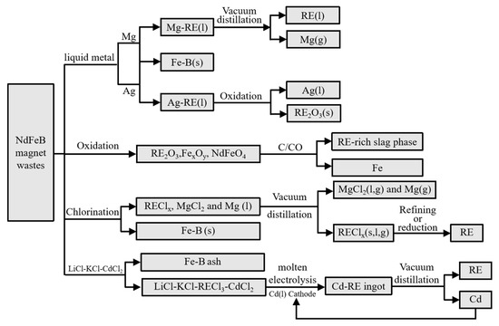 Industrial recycling of NdFeB scrap is mostly conducted by hydrometallurgy. However, it cannot be used in developed countries where environmental regulations are strict [86]. Pyrometallurgy can be used to avoid the high consumption of water and the generation of hazardous waste in the recovery process, but it is energy intensive and still in the research phase. The pyrometallurgical methods of recovering Nd as a metallic phase can be grouped into (1) metallurgical processes using reactive liquid metals (e.g., Mg and Ag), which are quickly forming intermetallic with Nd at high temperatures, as well as (2) electrolytic processes in molten chlorides followed by selective ionization of Nd from NdFeB.