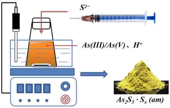 Arsenic is a typical pollutant in the metallurgical process, distributing in flue gas, wastewater, slag, sludge, and residue with various degrees. During the smelting of non-ferrous metals-bearing concentrates, most of the arsenic is volatilized and oxidized to As2O3 and As4O6 and then emitted with flue gas. Prior to the sulfuric acid production, arsenic compounds in flue gas must be eliminated because the arsenic influences the quality of the produced sulfuric acid. Hence, spray washing with the diluted acid is performed to remove the dust and arsenic from the pre-cleaned gas. It is worth mentioning that a large quantity of arsenic-containing acidic wastewater is discharged when flue gas is spray washed with dilute acid [1,2,3]. To remove arsenic from wastewater, numerous methods, including precipitation, adsorption, coagulation, and membrane separation, have been developed [4,5,6]. While sorption, coagulation, and membrane separation are generally only used for removal of low levels of arsenic up to 30 µmol/L. Precipitation is suited for the removal of arsenic from acidic, arsenic-rich wastewaters: precipitation as calcium arsenate, ferric arsenate, or arsenic sulfide. Furthermore, recent studies have shown that calcium arsenate is of large volumes and less stable than expected. Additionally, the ferric arsenate is not stable for long term storage because the reducing conditions can result in the reduction and mobilization of iron and arsenic. This technique requires the presence or addition of iron in/to the wastewater [7]. Among these methods, sulfide precipitation has been widely applied, due to its simple process and high efficiency, the potential for selective arsenic and heavy metal removal, and the production of small amounts of waste sludge.