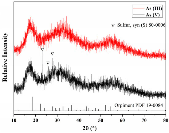 The XRD pattern of the precipitates sulfurized from As(III) and As(V), shown in Figure 5, indicates that the diffraction peaks were both weak and wide, confirming that the precipitates were mainly amorphous. In addition, the three broad humps that appeared at 2θ, around 18°, 31°, and 57°, were similar to the characteristic peaks of amorphous As2S3, while the characteristic peaks of elemental sulfur were detected in the XRD pattern of the precipitate-As(V). The results showed that precipitate-As(III) and precipitate-As(V) were mainly composed of amorphous As2S3, while the latter contained elemental S, which decomposed along with As2S3 by HxAs3S6x−3 first formed during the sulfurization of As(V). The characteristic peaks of amorphous As2S3 were consistent with those synthesized by other researchers through similar methods [13,14,15].
