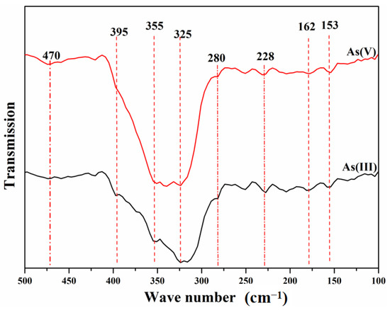 The FTIR results of the precipitate-As(III) and the precipitate-As(V) are shown in Figure 7. Three peaks at approximately 325 cm−1, 355 cm−1, and 395 cm−1 were all observed in the precipitate-As(III), while the characteristic peaks in the precipitate-As(V) were mainly located at approximately 325 cm−1 and 355 cm−1. The intensity of the peak at approximately 325 cm−1 in the precipitate-As(III) was significantly higher than that in the precipitate-As(V), while the intensity of the peak at 355 cm−1 was lower. It has been reported that the main characteristic peak in the structure of S-As glass is located at 310 cm−1, which corresponds to the As-S bond in the tapered structure of AsS3/2 [26,27]. In addition, there are two shoulder peaks at 345 cm−1 and 385 cm−1 in As2S3 glass [28]. The phenomena above suggests that arsenic sulfide existed as As2S3 in the precipitate-As(III) and the precipitate-As(V). Due to the difference in the structure of amorphous As2S3 formed by precipitation in solution and As2S3 glass, the three characteristic peaks (325 cm−1, 355 cm−1, and 395 cm−1) in the precipitates from As(III) and As(V) all shifted approximately 10 cm−1 with that of As2S3 glass (310 cm−1, 344 cm−1, and 385 cm−1).