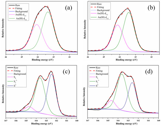 It has been reported that the peaks of As 3d5/2 at 43.1 eV and 43.4 eV were attributed to As4S4 and As2S3 [17]. Additionally, the peaks of S 2p at 161.9 eV, 162.9 eV, and 164.1 eV were attributed to S2−, S22−, and polymeric sulfur (S0) [29,30]. Additionally, combined with the results shown in Table 1, the peaks of As 3d5/2 in the precipitate-As(III) and the precipitate-As(V) at 43.4 eV were both attributed to As(III) in the As-S compound, and As(II) and As(V) did not appear, which is consistent with the results of Raman analysis, with only one characteristic peak of As2S3 at 340 cm−1. The valences of As on the surface of the two precipitates were mainly As(III), indicating that As(V) first reacted with S2− to form H3AsO3S and then produced elemental S and As2S3. Because the As(III) and S(II) could be rapidly precipitated, the evidence that As(V) and As(III) were reduced to As(II) in solution to form As4S4 has not been detected yet.
